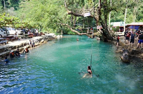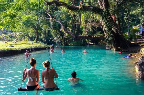 Blue Lagoon 1 is the most popular and accessible lagoon in Vang Vieng. Known for its vibrant turquoise water, it’s perfect for swimming, zip-lining, and relaxing. The area features a tree with jumping platforms, rope swings, and bamboo huts for resting.