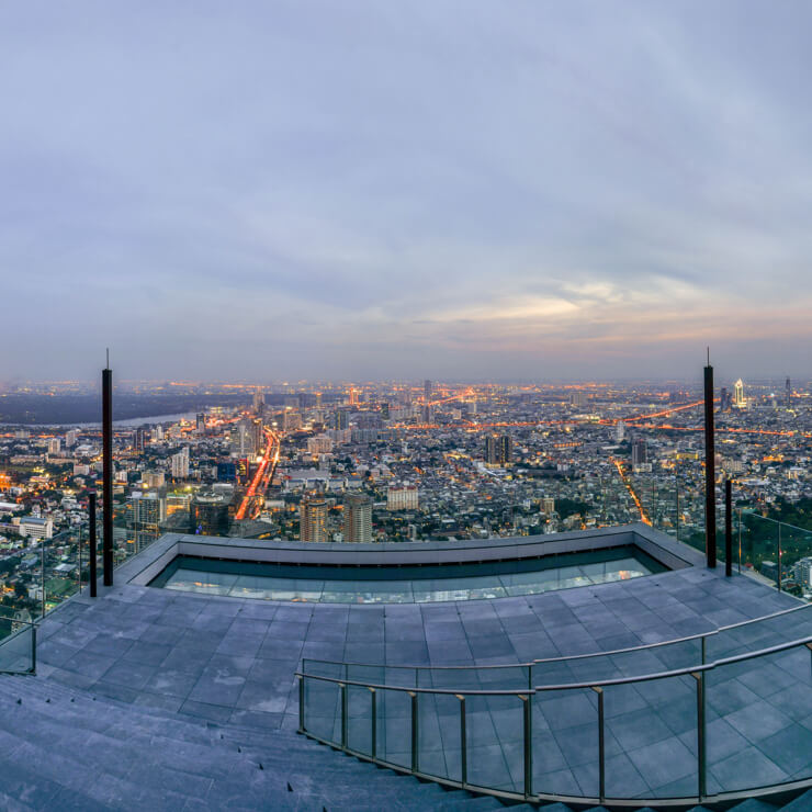 Mahanakhon SkyWalk is Thailand's highest observation deck, located in Bangkok at the top of the King Power Mahanakhon building, offering 360-degree panoramic views of the city. Key features include an indoor observation deck, a glass tray experience on the 78th floor for those unafraid of heights, and a rooftop bar. It is best visited just before sunset to see the city in daylight, at sunset, and as it lights up at night.